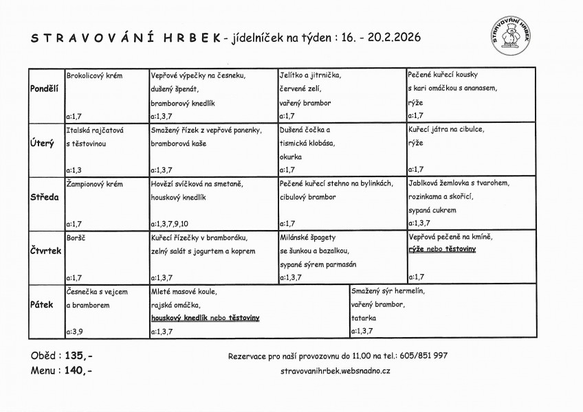 Cena provozovna - oběd : 135,- / menu : 140,-