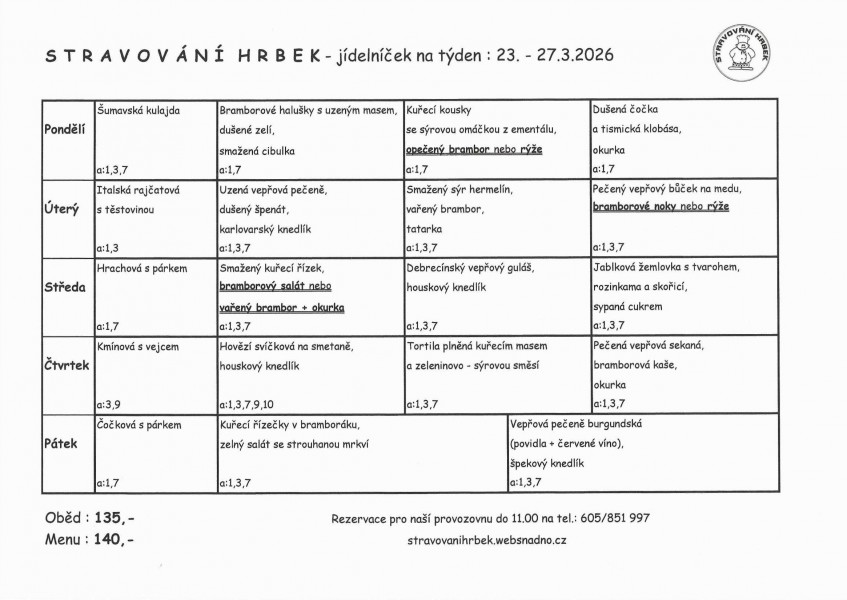 Cena provozovna - oběd : 135,- / menu : 140,-